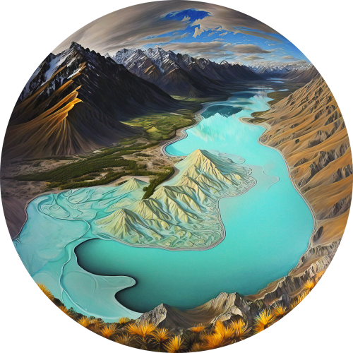 Striking landscapes transformed by the retreat of glaciers, the river flowing through the center of these artworks was likely fed by the melting ice of a glacier that once dominated the landscape. However, now the glacier has retreated, leaving behind a rocky, barren landscape dotted with patches of green vegetation.