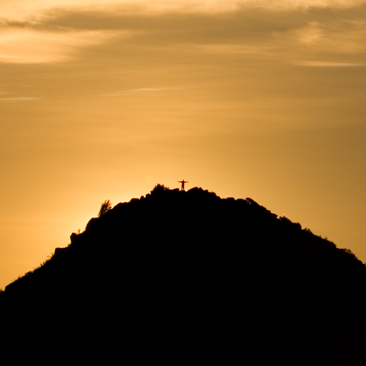Gibraltar Rock, nestled in the Port Hills near Christchurch, at sunset. Atop the rock a lone figure stands with arms outstretched, warmed by the last rays.