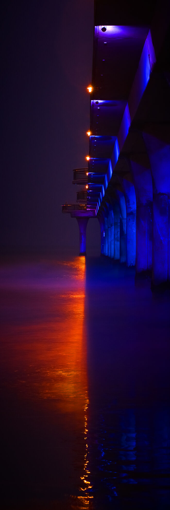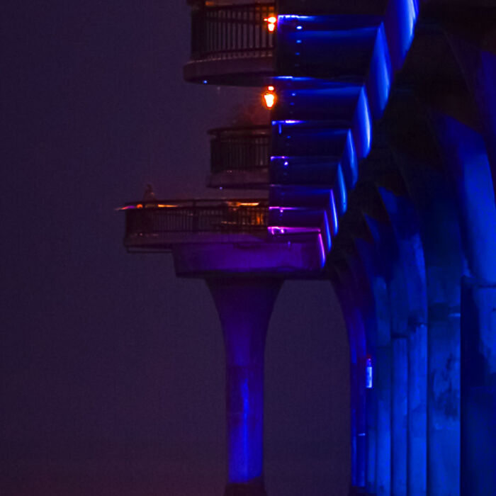 At night, the Pier is lit with changing hues, different colours lighting the base, and the waves below.