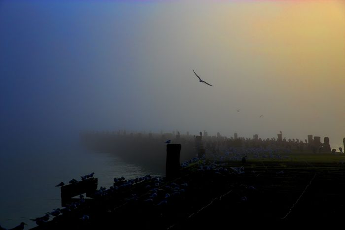 A break in heavy fog lights up the sky, early morning by Sumpter Wharf, Oamaru Harbour.