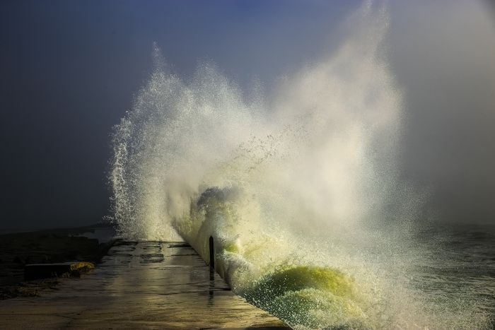 A break in heavy fog lights up a wave from a distant sunrise at the Oamaru Breakwater, Oamaru Harbour.